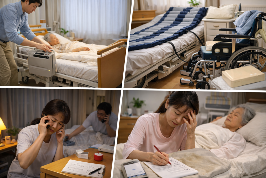 実際の現場では、体位変換・排泄・食事・清潔ケアに加えて、夜間の呼びかけや見守りが入ることも多く、家族の負担が“時間”として積み上がりやすい傾向があります。