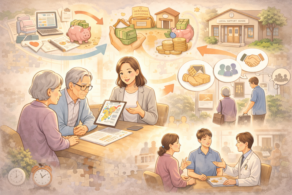 実際には、家族・ケアマネジャー・地域包括支援センターを交えたロードマップ作りが有効だとされています。状況は変わるため、定期的な見直しも前提にしておくと気持ちが楽になると言われています。